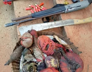 According to Tochukwu Ikenga, Spokesman for the Anambra Police Command, the arrested men include the alleged Chief Priest of the shrine, Chukwuemeka Emmanuel, aka “Ugoebenajah” (27), alongside Nwabunne Bright (27), Chinecherem Chiama (21), and Michael Ekwunife (38). Police recovered two pump-action guns, a locally made Beretta pistol, a machete, assorted ammunition, and criminal charms at the scene.